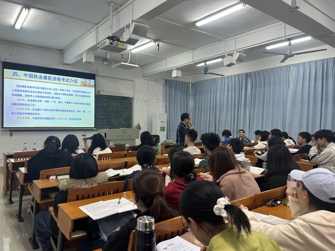 讲座围绕“走进兽医行业与了解兽医专业”“规划职业与学好专业”等核心议题展开,结合执业兽医考试政策与行业发展趋势,为学生提供了系统的学业与职业发展指导。石达友从宏观视角分析了兽医行业的机遇与挑战,吴颖瑶则通过自身从临床医生到职业规划师的转型经历,分享了宠物医疗领域的多元发展路径。