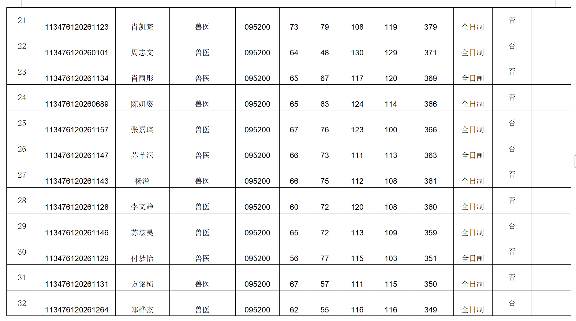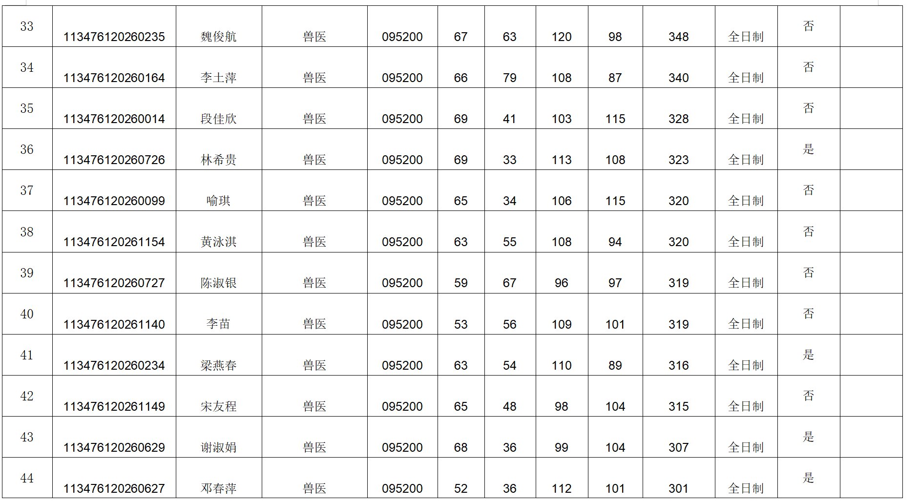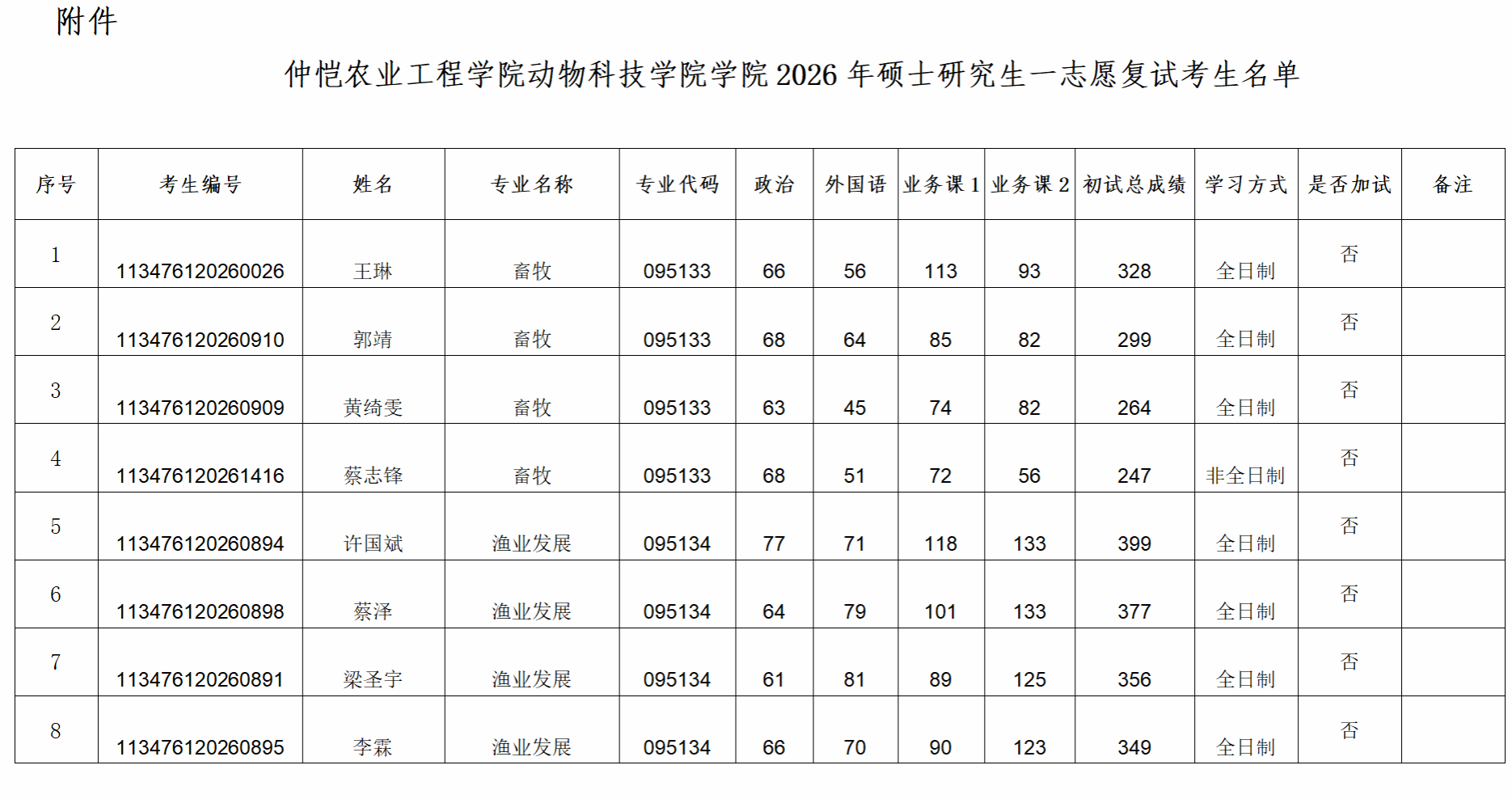 附件:动物科技学院2026年硕士研究生招生考试第一志愿复试考生名单