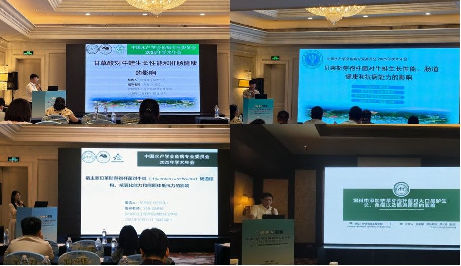 本次年会以"AI赋能推动水产病害防控新质生产力发展"为主题,来自国内外高校、科研院所和企业的700余位专家、学者和学生代表参会。与会代表围绕鱼类健康养殖、病害防控新技术等议题展开了广泛讨论。会议期间,水产病害团队的7名研究生积极参与学术交流,分别从益生菌应用、病毒流行病学、病原致病机理、中草药添加剂和抗寄生虫材料等多个研究方向汇报了最新成果。这些研究紧扣产业需求,重点关注牛蛙、大口黑鲈等重要养殖品种的健康养殖技术,体现了我校水产团队在推动水产养殖绿色发展方面的持续探索。